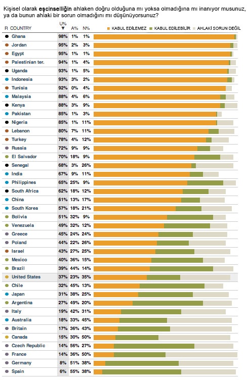 pew`in hazırladığı rapora göre; 40 ülkenin eşcinsellik hakkında düşündükleri... abd’nin saygın kuruluşlarından pew araştırma şirketi, dünya genelinde bir araştıma yaparak farklı ülkelerde yaşayan insanların eşcinselliğe bakış açılarını ortaya çıkardı. eşcinselliğin "ahlaken kabul edilemez" olduğu..