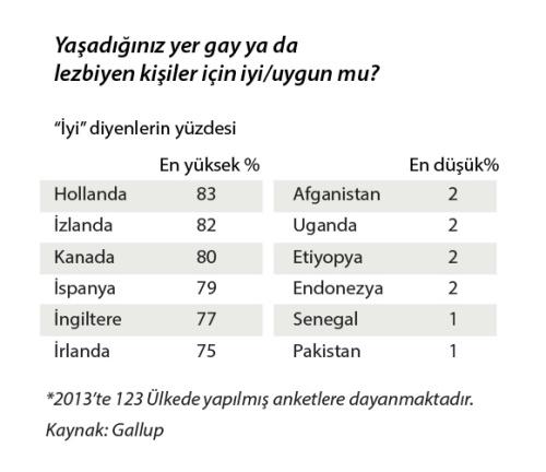 dünya`da 8 milyar insan var, ancak eşitlik ve özgürlük konusunda hala atmadığımız 8 milyar adım olabilir. gallup "sizin ülkeniz gay ve lezbiyenler için yaşanabilir mi?" diye sordu. İşte yanıtları. 123 ülkeyi kapsayan, her ülkeden 15 yaş ve üstü 1000 katılımcının yanıtları doğrultusunda düzenlenen..