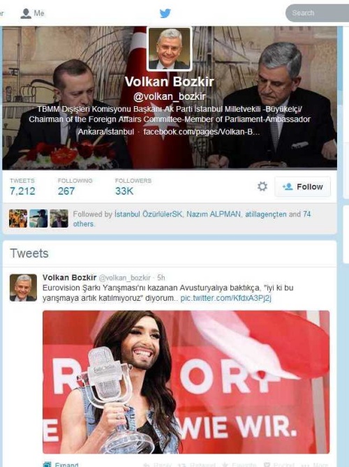 tbmm dışişleri komisyonu başkanı bozkır "İyi ki bu yarışmaya artık katılmıyoruz" dedi, tweet`i sildi. ak parti İstanbul milletvekili ve tbmm dışişleri komisyonu başkanı volkan bozkır, eurovision 2014’ü kazanan avusturyalı şarkıcı conchita wurst’un kazanmasına yönelik bir tweet atarak “eurovision ..
