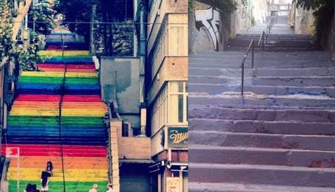 fındıklı`dan cihangir`e çıkan merdivenler lgbt hareketinin sembolü olan gökkuşağı bayrağının renklerine boyandı. boyama işinin kim tarafından ve neden yapıldığı merak konusu oldu... bigumigu.com adlı sitede yer alan bilgilere göre projenin fikir babası hüseyin çelikel. hüseyin çelikel çokça kulla..
