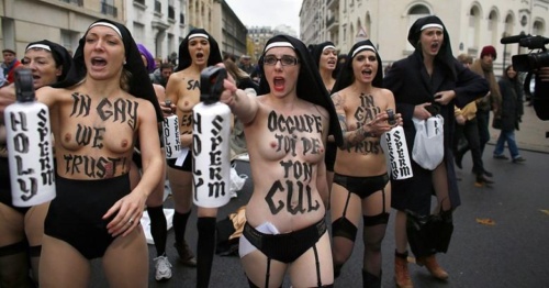 fransa`da hükümetin eşcinsel evliliğe izin veren kanun tasarısına tepki gösterisi çatışmaya dönüştü. başkent paris`te bir grup gösterici femen örgütü üyeleriyle karşı karşıya geldi. eşcinsellik karşıtı katoliklerin paris`teki yürüyüşünü, rahibe türbanlarıyla basan femen aktivisti çiplak eylemcil..
