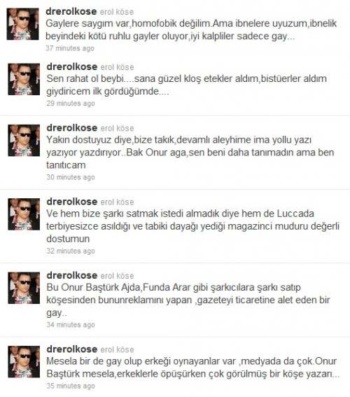 ünlü yapımcı erol köse, twitter`dan hürriyet yazarı onur baştürk hakkında inanılmaz iddialarda bulundu! onur baştürk`ün isim vermeden yazdığı yazı, erol köse`yi çileden çıkardı. twitter`dan daha önce haluk bilginer, hadise gibi çok sayıda ünlü isim hakkında çarpıcı iddialar ortaya atan köse, hür..