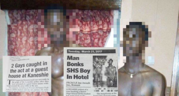 İki eşcinsel erkek, ilişkide bulunduğu için zorla fotoğraflanıp, gözaltına alındı. yerel basındaki haberlere göre, olayla ilgili olarak 18 ve 28 yaşlarındaki erkekler accra otelinde tutuklandı. resepsiyonist, çifti “şüpheli” olarak gördü. ganaweb’deki habere göre, olayın ardından polis çağrıldı v..